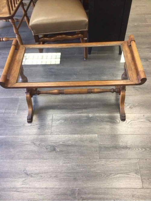 GLASS TOP CARVED WOOD COFFEE TABLE
