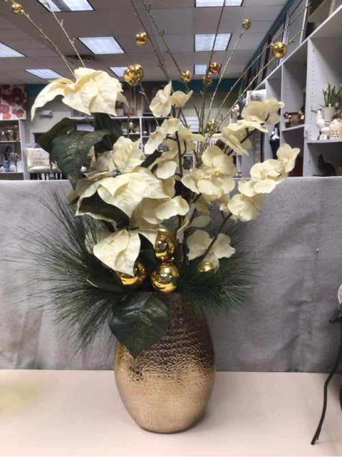 GOLD WHITE FLORAL XMAS ARNG W/VASE