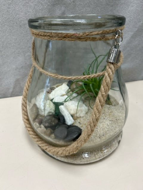 GLASS TERRARIUM W/SAND & FAUX PLANTS