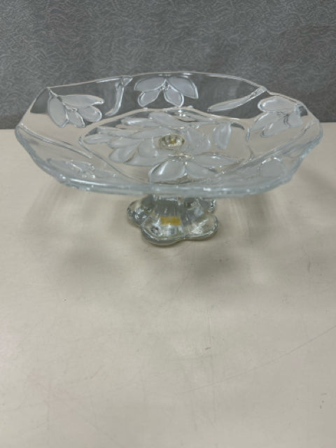 CLEAR GLASS FLORAL PEDESTAL TRAY