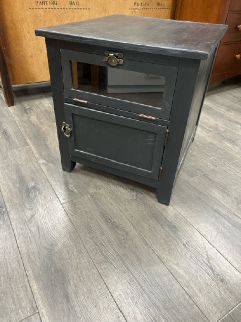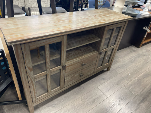 BROWN WOOD CONSOLE W/GLASS CABINETS