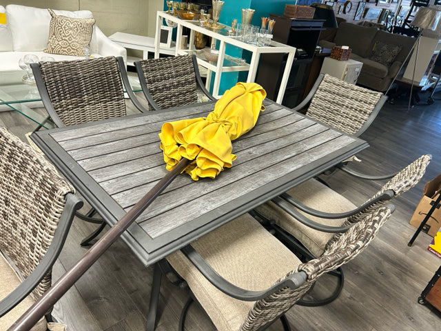 METAL PATIO TABLE W/6 CHAIRS & UMBRELLA