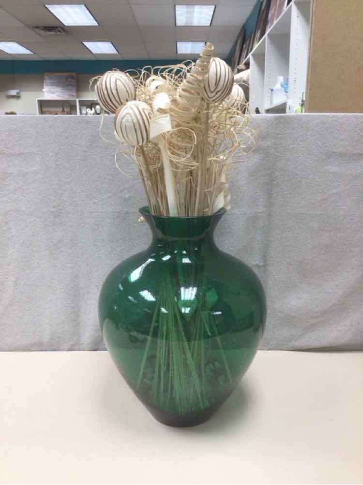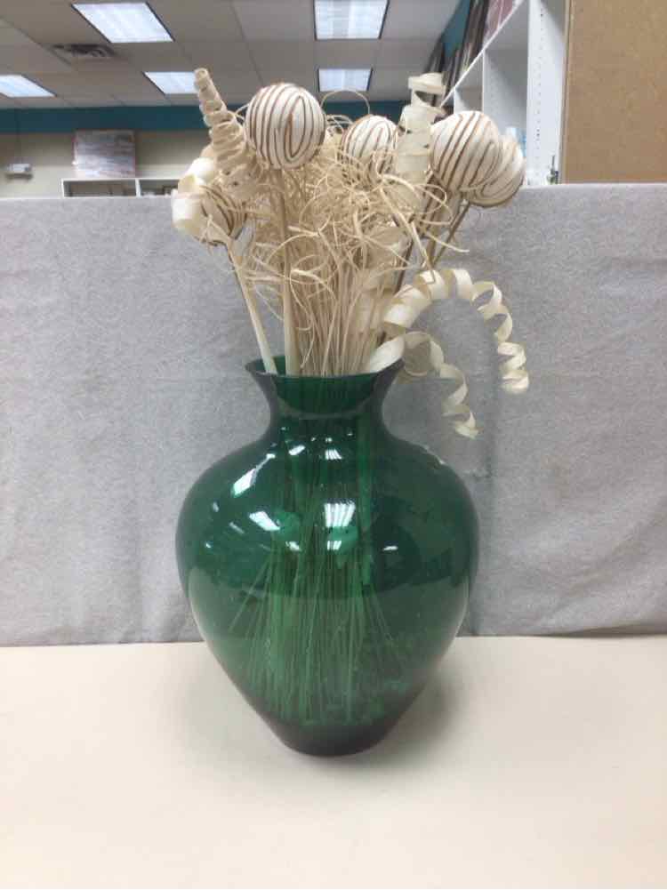 GREEN GLASS VASE W/BEIGE FILLER